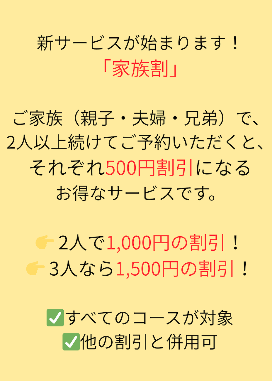 ・電話予約:「家族割希望」とお伝えください📞